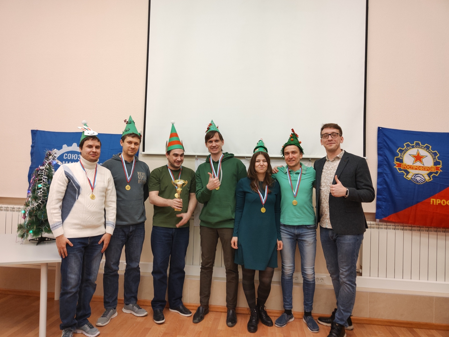 По доброй традиции на финальную игру знатоки пришли в новогодних костюмах и приз за креативные новогодние наряды также достался команде «Lego». Ребята пришли с чудесными шапочками-елочками. Председатель профсоюзной организации УОМЗ, член Свердловского регионального отделения СоюзМаш России Василий Насадюк вручил приз (билеты в зоопарк) команде «Третьи сыновья».До встречи в новом сезоне 2023!